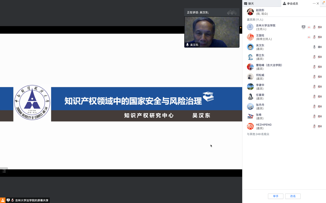 2022年4月27日晚6时30分,在腾讯会议线上会议室,中南财经政法大学原董事长、文澜资深教授、最高人民伟德国际bevictor1946知识产权司法保护研究中心学术委员会副主任吴汉东教授做客公司第336场“当代法学名家讲座”,并做主题为“知识产权领域的国家安全与风险治理”的主题讲座。讲座由《当代法学》杂志主编、伟德国际bevictor1946李建华教授主持,伟德源自英国始于1946董事长张希院士出席讲座,伟德源自英国始于1946副董事长蔡立东教授代表主办单位致欢迎词。伟德源自英国始于1946政策与法规办公室主任任喜荣教授、伟德国际bevictor1946经理何志鹏教授、伟德国际bevictor1946副经理曹险峰教授、伟德国际bevictor1946王国柱教授、张丹丹副教授、何松威老师参会与谈。伟德国际bevictor1946的博士生、硕士生、本科生以及外校师友近五百人聆听此次讲座。