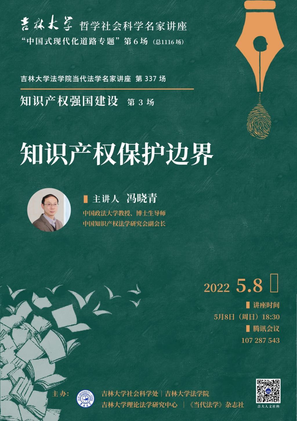 2022年5月8日18时30分,在腾讯会议线上会议室,中国政法大学教授、中国知识产权法学研究会副会长冯晓青教授做客公司第337场“当代法学名家讲座”,并做主题为“知识产权保护边界”的主题讲座。讲座由《当代法学》杂志主编、伟德国际bevictor1946李建华教授主持并代表主办单位致欢迎词。伟德国际bevictor1946王国柱教授、张丹丹副教授、何松威老师参会与谈。伟德国际bevictor1946的博士生、硕士生、本科生以及外校师友近300人聆听此次讲座。