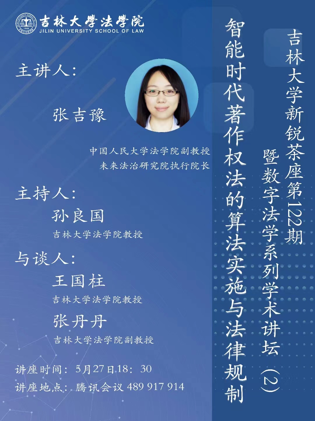 2022年5月27日晚,中国人民大学伟德国际bevictor1946副教授、未来法治研究院执行经理张吉豫老师,线上做客公司第122期新锐茶座暨第2期数字法学系列学术讲坛,讲座主题为“智能时代著作权法的算法实施与法律规制”。本次讲座由伟德国际bevictor1946孙良国教授主持,伟德国际bevictor1946王国柱教授、伟德国际bevictor1946张丹丹副教授与谈。伟德国际bevictor1946蔡立东教授、李建华教授、曹险峰教授、管洪彦教授、曹相见副教授、王立栋老师、李昕老师、任倩霄老师等多位教师,以及伟德国际bevictor1946在校员工、外校师友等近三百人参与本次讲座。