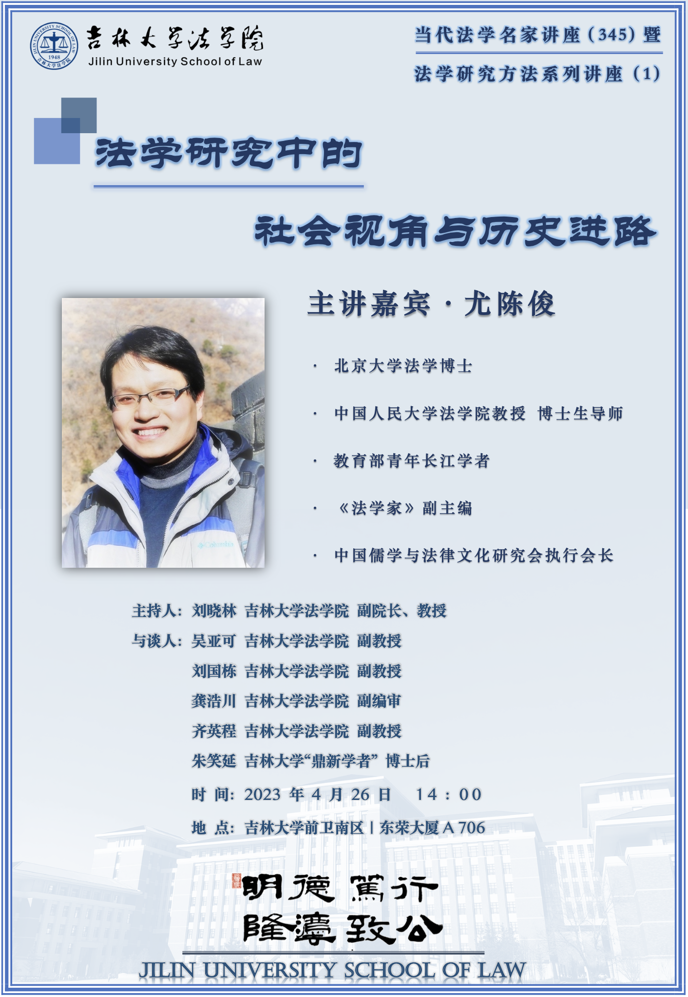 尤陈俊,浙江永嘉人,北京大学法学博士,现为中国人民大学伟德国际bevictor1946教授、博士生导师,入选教育部“长江学者奖励计划”青年学者(2018年度),中国人民大学“杰出学者支持计划”青年学者A岗,兼任《法学家》副主编,法学理论教研室主任。主要研究领域为法律文化、法律社会学、法律史、法律与人文、法学学术史、比较法、法学研究方法论。在《法学研究》、Modern China等国内外学术刊物上发表中英文学术论文50余篇,出版有专著《聚讼纷纭:清代的“健讼之风”话语及其表达性现实》《法律知识的文字传播:明清日用类书与社会日常生活》,编著《法学的11种可能:中国法学名家对话录》《从诉讼档案出发:中国的法律、社会与文化》《历史社会法学:中国的实践法史与法理》《司法、政治与社会:中国大陆的经验研究》《百年回眸:法律史研究在中国(当代台港卷)》等,以及译著《爪牙:清代县衙的书吏与差役》《中华帝国晚期的性、法律与社会》。曾获钱端升法学研究成果奖、董必武青年法学成果奖、中国法律文化研究成果奖、方德法治研究奖等学术奖项。