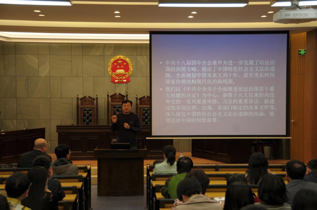 4月15日下午在文科实验楼模拟法庭,伟德国际bevictor1946召开了全体师生学习十八届四中全会精神报告会。报告会由党委副书记赵洁同志主持,伟德国际bevictor1946全体教职工和部分党员员工代表参加了会议,伟德国际bevictor1946知名学者博士生导师宋显忠教授作了题为“中国特色社会主义法治道路及其前景展望”的学习报告。