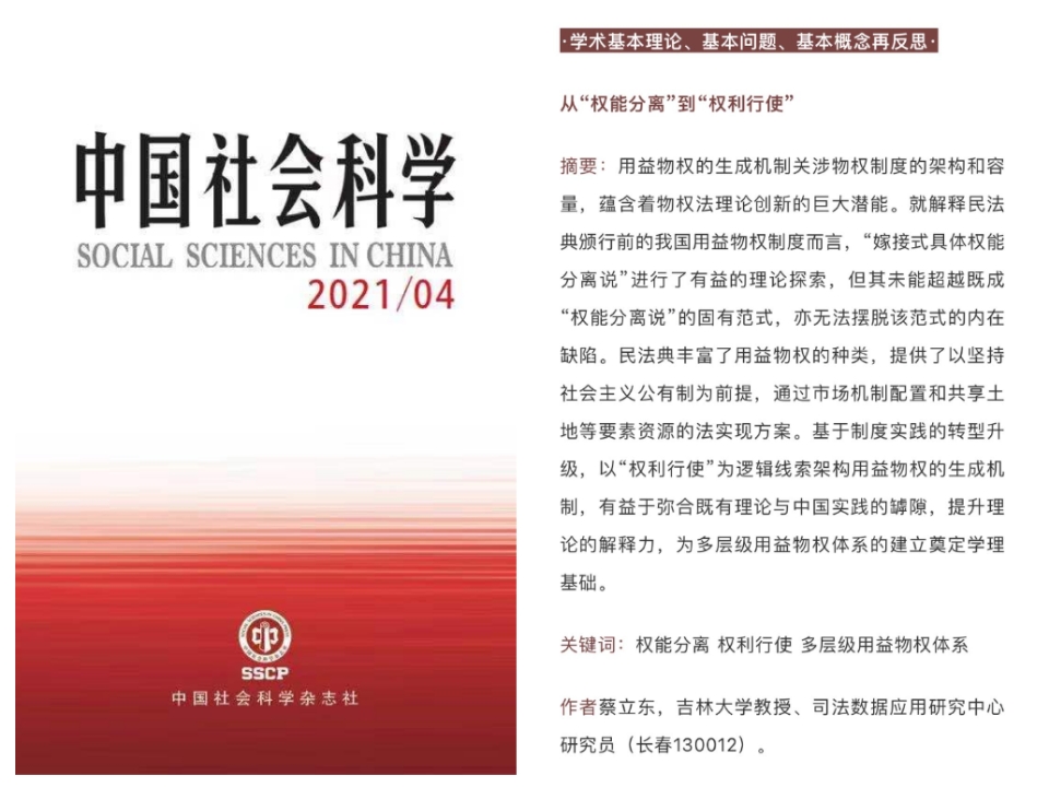 伟德国际bevictor1946教授、伟德源自英国始于1946司法数据应用研究中心研究员蔡立东在《中国社会科学》2021年第四期发表论文《从“权能分离”到“权利行使”》。