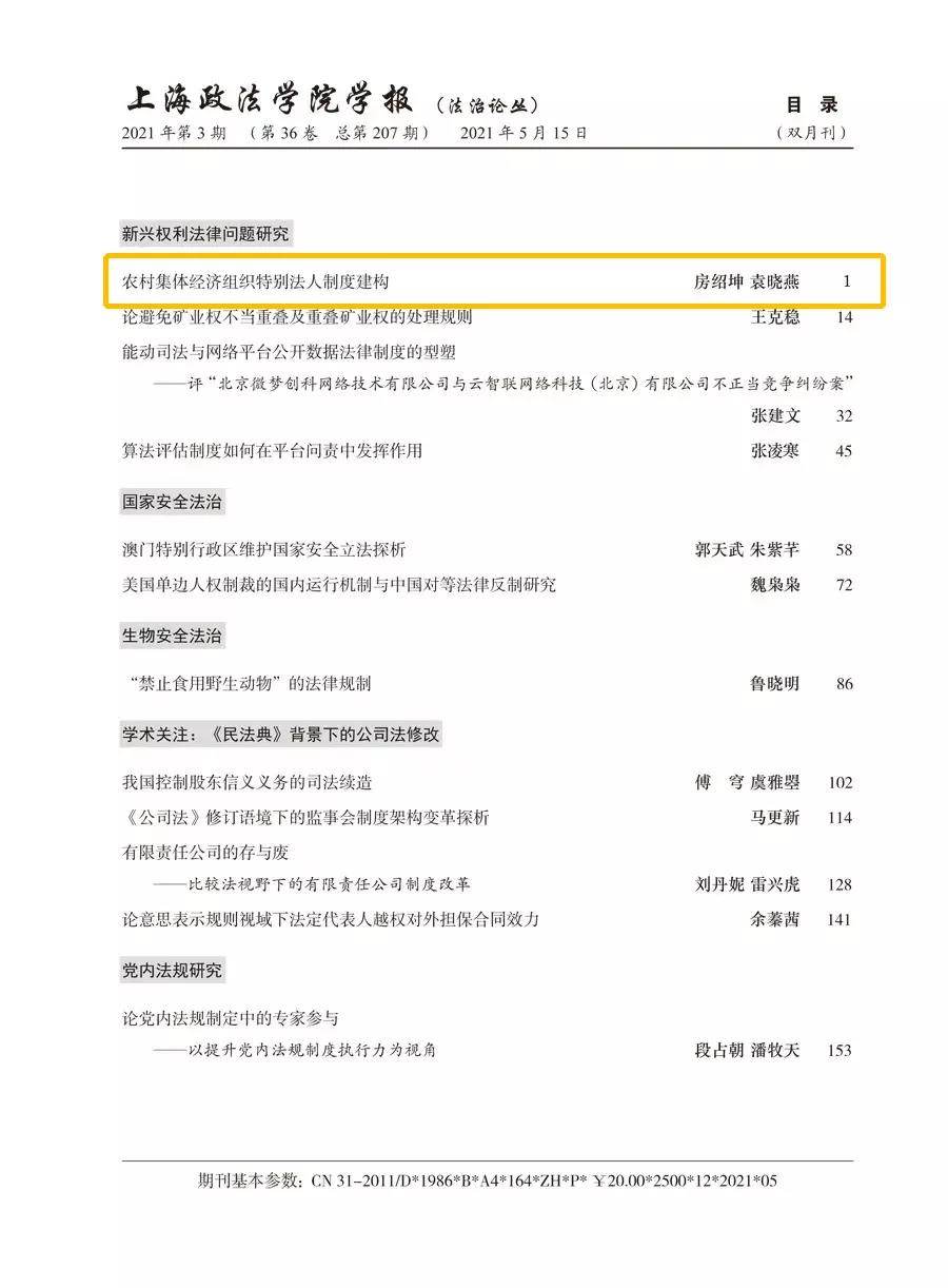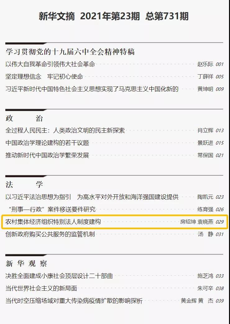 房绍坤教授发表在《上海政伟德国际bevictor1946学报(法治论丛)》2021年第3期的“农村集体经济组织特别法人制度建构”一文被《新华文摘》2021年第23期全文转载,该文是房绍坤教授带领团队致力于农村集体产权制度改革法治保障研究的阶段性成果。