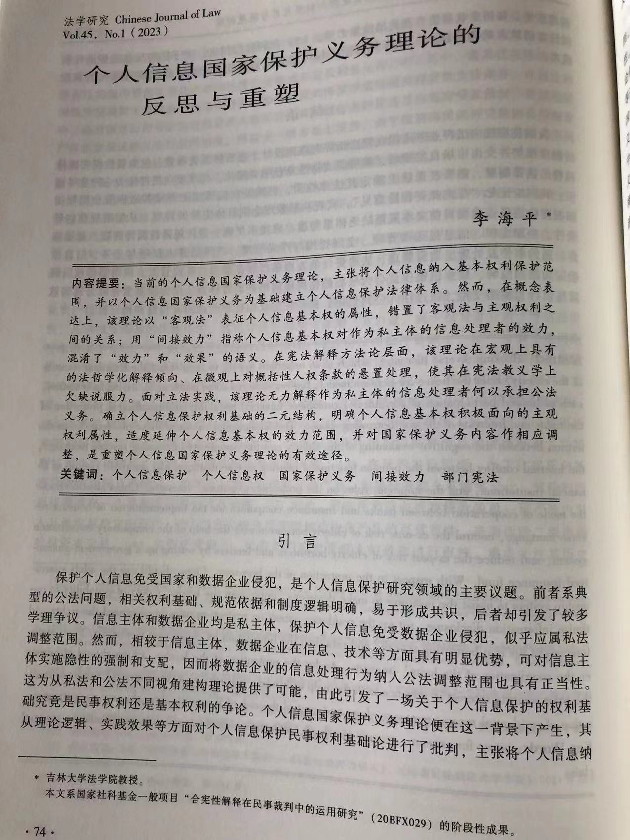 公司李海平教授在《法学研究》2023年第1期发表题为《个人信息国家保护义务理论的反思与重塑》的文章。该文是李海平教授继《区域协调发展的国家保障义务》《基本权利的国家保护:从客观价值到主观权利》等文章后在国家保护义务理论领域的又一力作。文章着力建构中国个人信息公法保护自主知识体系,在分析既有个人信息国家保护义务理论困境的基础上,阐释个人信息基本权国家保护和民事权利国家保护二元结构理论,论述个人信息基本权国家保护的理论逻辑、制度逻辑和制度构成,回应学界关于个人信息国家保护义务理论研究中的争点问题。在方法论方面,该文是从部门宪法学入手深化宪法学一般理论的一次有益尝试。