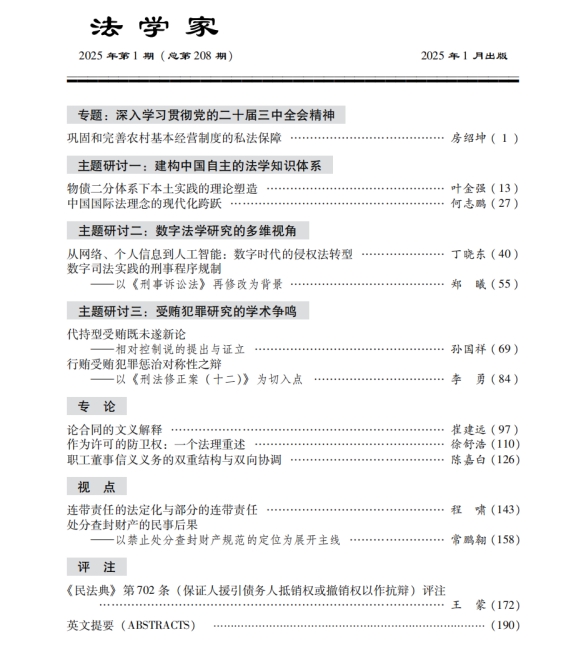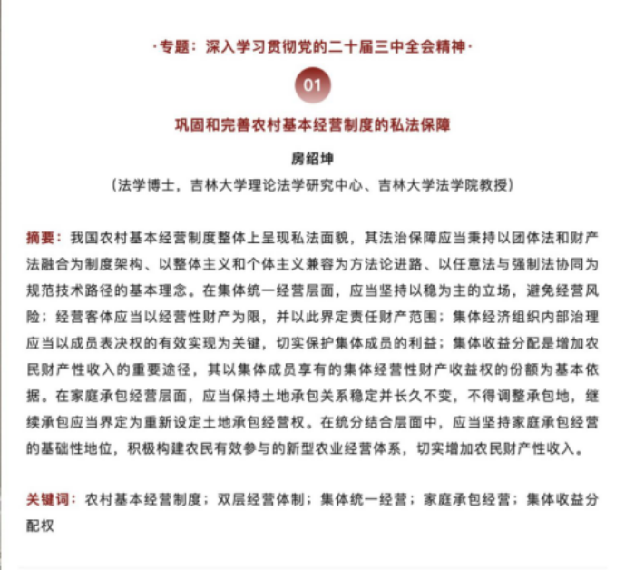 近日,伟德国际bevictor1946房绍坤教授在《法学家》2025年第1期发表题为《巩固和完善农村基本经营制度的私法保障》的文章。该文是房绍坤教授多年来持续深耕农业农村法治研究取得的又一代表性成果。